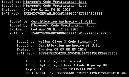如下图所示为WoSign Windows内核代码签名证书,颁发根证书为:WoSign Code Signing CA,证书主题中“O”字段(Organization)会显示申请单位的中文名称。