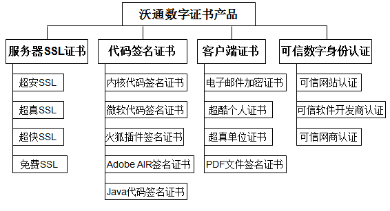 沃通提供各类基于PKI技术应用的软硬件产品服务。时间戳服务为电子数据提供可信时间证明和内容真实性、完整性证明;签名验签服务器提供数字签名、验证签名等运算功能, 保证关键业务信息的真实性、完整性和不可否认性;电子签章机对电子文档签名并加盖签章,用于验证电子文档签署者身份,确保签名行为的不可抵赖;MK-1 USB Key用作数字证书和私钥的安全存储硬件载体,保证用户密钥安全。