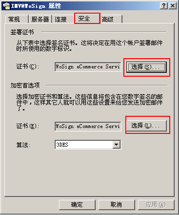 (1) 在 Outllok Express 的“工具” - “帐号”中选中需要签名的电子邮件帐号,点击“属性” - “安全”,如图 1 所示,点击第 1 个“选择”从 Windows 证书存储区选择签名证书(就是我们颁发给您的Trust Supplier ID),点击第 2 个“选择”从 Windows 证书存储区选择加密证书,您还可以选择不同的加密算法。