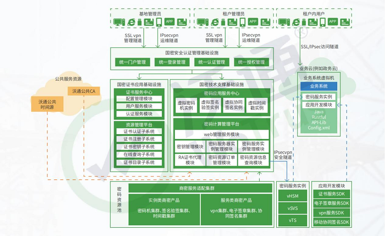 沃通电子政务云密码服务平台建设方案将密码技术与云计算有效结合,实现与业务信息系统高度融合,各类核心业务系统提供安全合规、敏捷高效、广泛兼容、功能完备的密码服务。云密码服务平台具备云服务“即插即用、弹性扩容、易于运维、平滑演进”的技术优势,同时针对密码应用建设的特性需求,在服务合规性、兼容已有商用密码产品与服务等方面进行重点设计,构建标准化、符合业务密码应用需求的平台支撑能力。云密码服务平台设计采用多层次、多场景的全栈式密码服务能力;提供高度可扩展的服务能力,并支持未来分级扩展;建设全自动化的密码服务能力,为海量的密码需求提供高并发、高吞吐量的密码支撑,支持按需分配、动态扩展的应用能力;提供高可用、高可靠的运维支撑和自我防护能力,采用双活设计;支持智能化的密码服务运维管理能力,实现服务、业务、日志全链路监控、密码设备监控等智能化运维;建立专业化的密钥管理运营模式,充分考虑密码的全生命周期管理,全面保障密钥运算及管理基础设施的安全保护,实现密码资源的集约化、服务化、智能化,助力政务数据安全享。