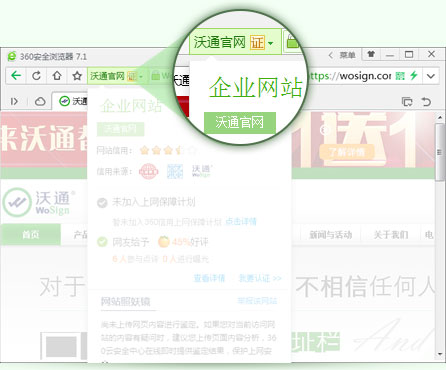 推送网站至360信用平台,免费享受1年认证联盟实名网站认证服务。通过审核后,点亮浏览器名片,在多个浏览器终端展示。