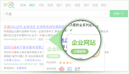 推送网站至360信用平台,免费享受1年认证联盟实名网站认证服务。通过审核后,搜索终端展现搜索名片。