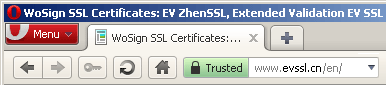 EV SecSSL is a Extended Validation SSL certificate issued by WoSign, when the browser visit a EV SSL secured website, the address bar turns green to tell customer this is a trustworthy website. Same green bar, but cost less! Green means "Trust"!