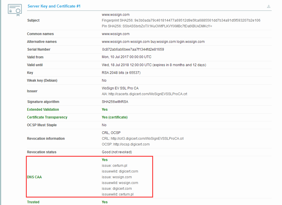 SSL Labs已经将DNS CAA记录纳入SSL体检项目中,通过SSL Labs可以检查自己的域名是否设置了CAA记录,还可查看已发布CAA记录的详细信息。