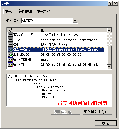 证书吊销列表分发点 (CRL Distribution Point ,简称 CDP) 是含在数字证书中的一个可以供各种应用软件自动下载的最新的 CRL 的位置信息。一个 CDP 通常出现在数字证书的 详细信息 选项卡的 CRL 分发点 域,一般会列出多个使用不同的访问方法,以确保如 Web 浏览器和 Web 服务器程序始终可以获取最新的 CRL 。 CDP 一般是一个可以访问 http 网址, 如下图 3 所示: