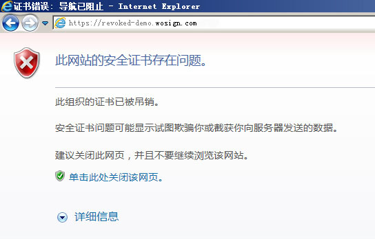 那么,证书吊销列表起什么作用?为了演示,我们在测试站点上部署了一张吊销了的SSL证书https://revoked-demo.wosign.com 。上面已经提到是供有关软件查询证书是否被吊销,还是让我们来看看浏览器是如何查询吊销列表的。 浏览器在使用 https:// 访问已经部署了 SSL 证书的网站时,定会先检查此 SSL证书是否已经被吊销,也就是说会查询吊销列表或 OCSP 服务, 如果此证书已经被证书颁发机构吊销,则会显示警告信息: “此组织的证书已被吊销。安全证书问题可能显示试图欺骗您或截获您向服务器发送的数据。建议关闭此网页,并且不要继续浏览该网站。 ”
