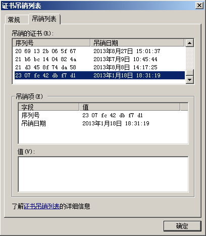 答:证书吊销列表 (Certificate Revocation List ,简称: CRL) 是 PKI 系统中的一个结构化数据文件,该文件包含了证书颁发机构 (CA) 已经吊销的证书的序列号及其吊销日期。 CRL 文件中还包含证书颁发机构信息、吊销列表失效时间和下一次更新时间,以及采用的签名算法等。证书吊销列表最短的有效期为一个小时,一般为 1 天,甚至一个月不等,由各个证书颁发机构在设置其证书颁发系统时设置。如下图 1 和图 2 所示: