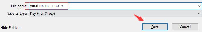 点击创建CSR后,这时会弹出一个对话框,让您选择文件保存的位置和文件的名称,建议使用域名信息命名如:yourdomain.com.key,选择好文件保存位置,填写好文件名称后,点击保存。