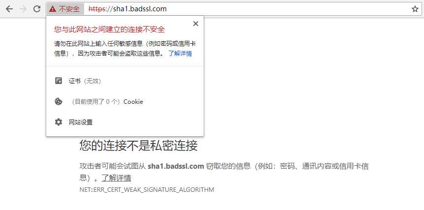 SHA-1算法已经被证实非常不安全,谷歌从Chrome 48开始阻止新签发的SHA-1算法SSL证书,从Chrome 56开始阻止所有SHA-1算法SSL证书。因此,使用SHA-1证书的网站,浏览器会标记红色“不安全”警告。
