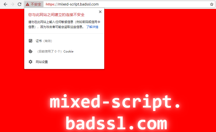 一些网站已经部署了HTTPS证书,但是网页中调用了非HTTPS的外部资源(图片或js)时,网站会存在不安全因素,对这类网站浏览器也会标记“你与此网站之间建立的连接不安全”,如果用户选择加载不安全内容,浏览器就会升级为红色“不安全”警告。