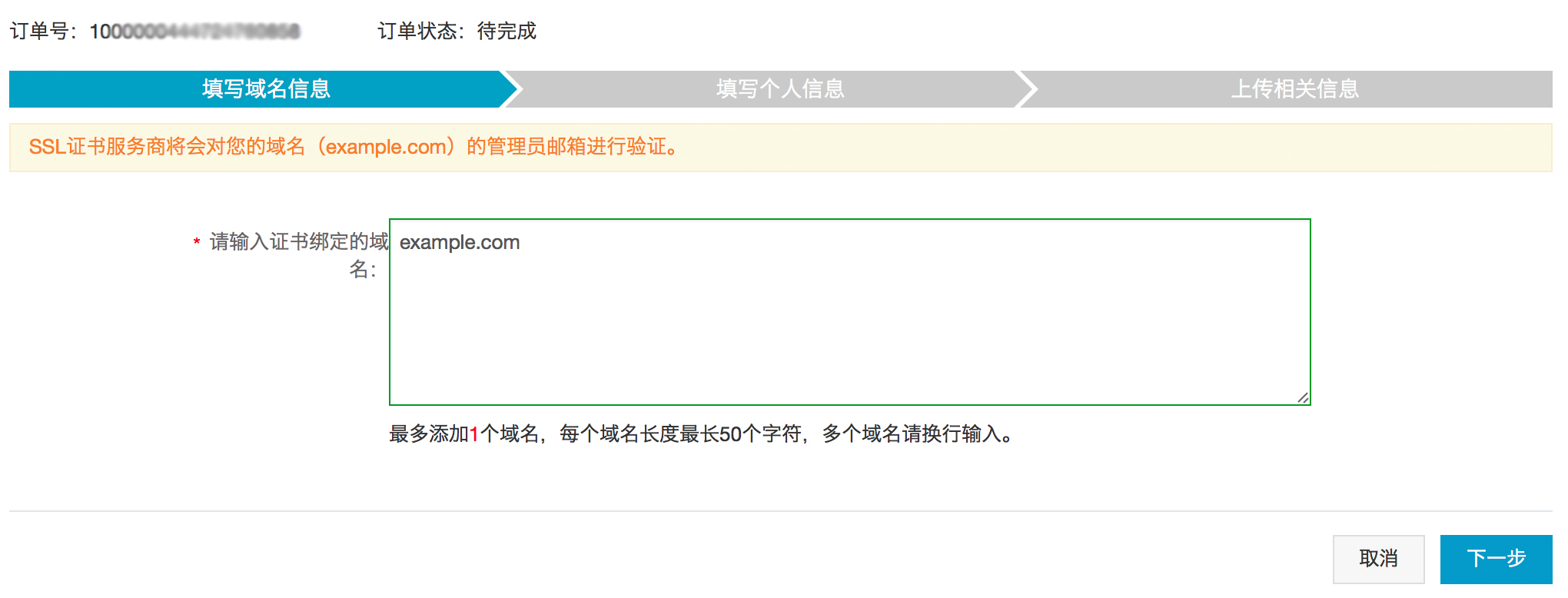 当您支付完订单后,需要填写证书的详细信息并且提交审核才能完成证书申请流程。 您可以通过证书列表订单中的“信息补全”操作来进入资料的填写页面。