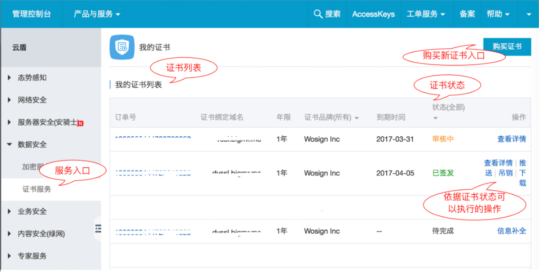 发布日期:2016-07-20阿里云和沃通SSL证书合作,上线一键部署SSL证书功能,支持在线申请SSL证书,一键推送至所有云产品,自动安装部署,快速实现https加密。阿里云盾DDOS高防IP已经实现自动部署https服务,CDN/SLB/云邮箱等云产品也即将实现自动部署https服务。本文给大家介绍一下阿里云DDOS/CDN/SLB 一键安装配置WoSign SSL证书方法。