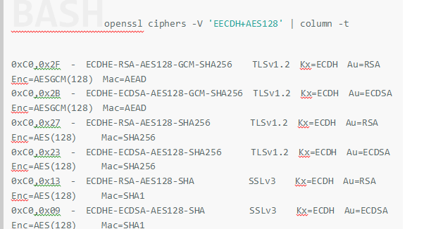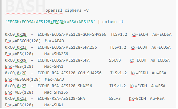 研究发现,Chrome 与服务端协商到的 Cipher Suites 是 ECDHE-RSA-AES128-GCM-SHA256,来自于 ssl_ciphers 配置中的 EECDH+AES128 这部分。我们通过 openssl 工具看一下 EECDH+AES128 具体包含哪些 Cipher Suites: