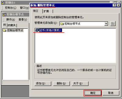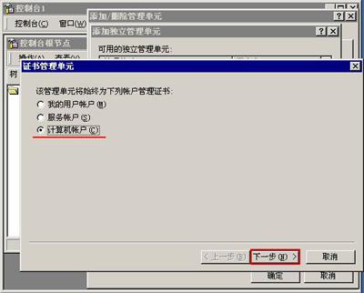 2. 点击“添加”出现新的弹出框,找出并选中“证书”,点击“添加”后选择“计算机帐户”后点击“下一步” :
