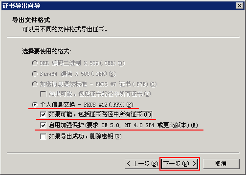 6. 选择“是,导出私钥(Y)”,点击“下一步”按钮,导出您的数字证书备份 ,选择“包含证书路径中所有证书”,点击“下一步”按钮 :