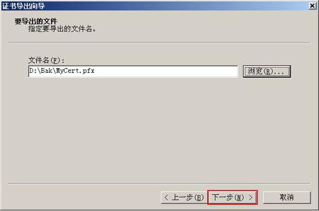 7.在密码框内输入您的服务器SSL证书私钥密码,一定要有足够长度 ( 建议 6 位以上 ) ,以后导入安装时需要此密码,一定不能忘了此密码,否则如果服务器重装时需要导入您的SSL证书就没有办法了。点击“下一步”按钮 按照下图指示,选择您的SSL证书保存目录和文件名,点击“下一步”按钮 :