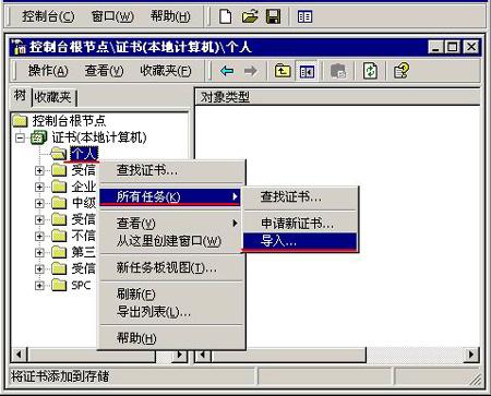 1.首先“运行”中输入“ mmc ”调出“控制台”窗口,在“证书” - “个人”菜单右击鼠标就可以看到“所有任务” - “导入”按步骤就可以导入您的服务器SSL证书即可 :