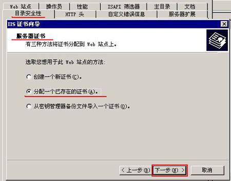 2. 导入证书后,您还要到“ Internet 服务管理器”中为您的网站分配一个系统中已经存在的证书,点击“目录安全性” - “服务器证书”即可,请注意:只能在原申请证书的域名(网站)上使用ssl证书: