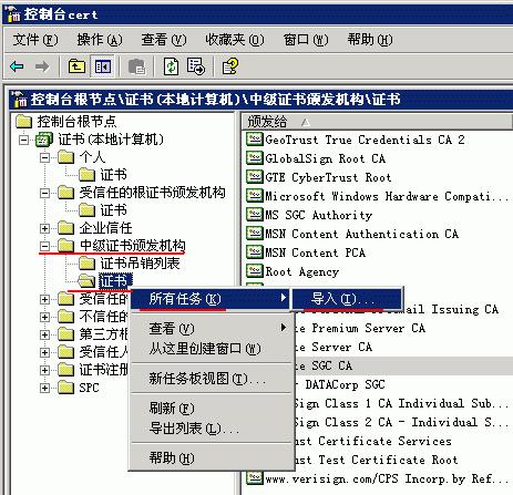 3. 如果您在导出备份时没有选中“包含证书路径中所有证书”,则表明您没有备份整个证书链,在导入安装时可能会有问题。补救的办法就是手动导入中级根证书:如果您申请的是wosign ov ssl证书,则需要下载 其中级根证书;如果您购买的是wosign ov ssl pro证书,则需要下载其中级根证书;如果您购买的是wosign dv ssl证书,则需要下载其中级根证书;并按照如下图示在“中级证书颁发机构”-“证书”右击后的“所有任务”中的“导入”即可安装成功 :