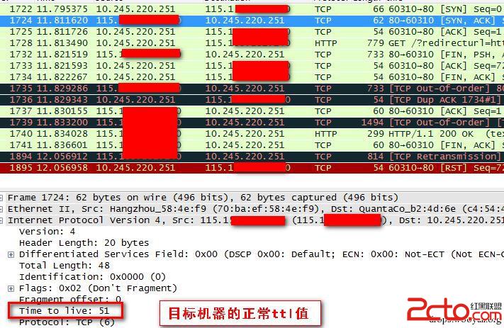 通过分析抓取的样本数据发现,数据包在传输过程中出现异常TTL,目标机的正常TTL为51如图2。