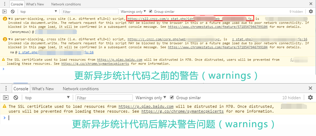 经过站点实测,更新异步统计代码后,Chrome对CNZZ统计代码的warnings已经消失,网站页面和统计功能都正常。剩下的一个warning是Chrome对百度商桥的SSL证书即将在赛门铁克证书制裁策略中失效的警告,不属于本文讨论范围。