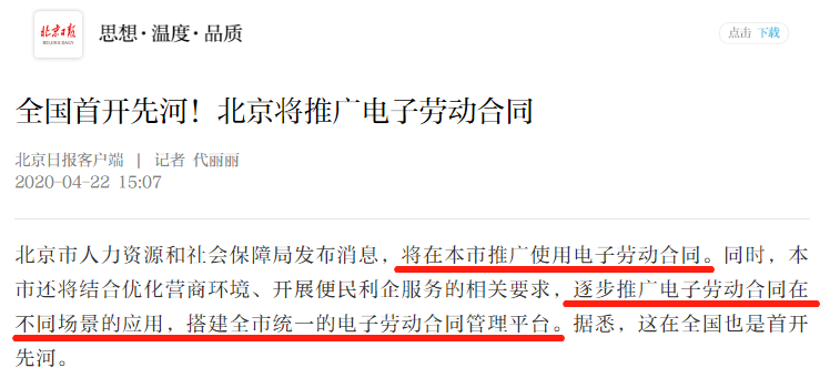 发布日期:2020-04-244月22日,北京市人力资源和社会保障局发布消息,将在本市推广使用电子劳动合同。同时,本市还将结合优化营商环境、开展便民利企服务的相关要求,逐步推广电子劳动合同在不同场景的应用,搭建全市统一的电子劳动合同管理平台。