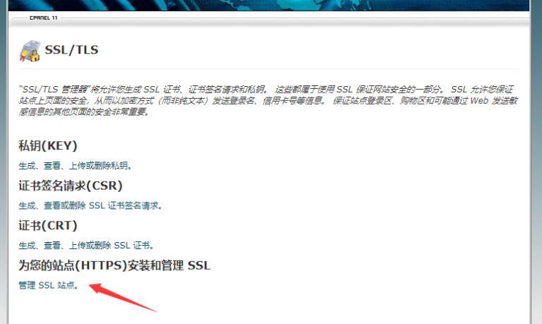 在网页的下部找到“安装 SSL 网站”,开始配置证书。