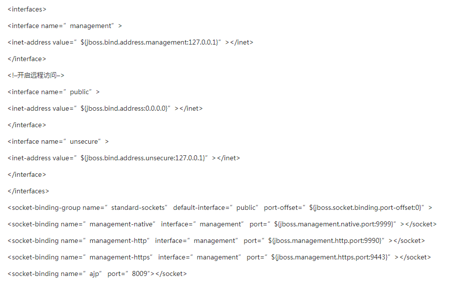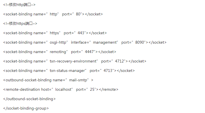 第三步,修改服务端口。进入JBoss主目录中的standalone/configuration,修改standalone.xml文件。
