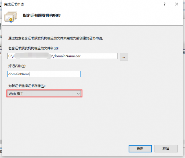 在“完成证书申请”界面,选择cer文件并填写相关信息,点击确定。导入证书前建议将文件名改为你的域名。