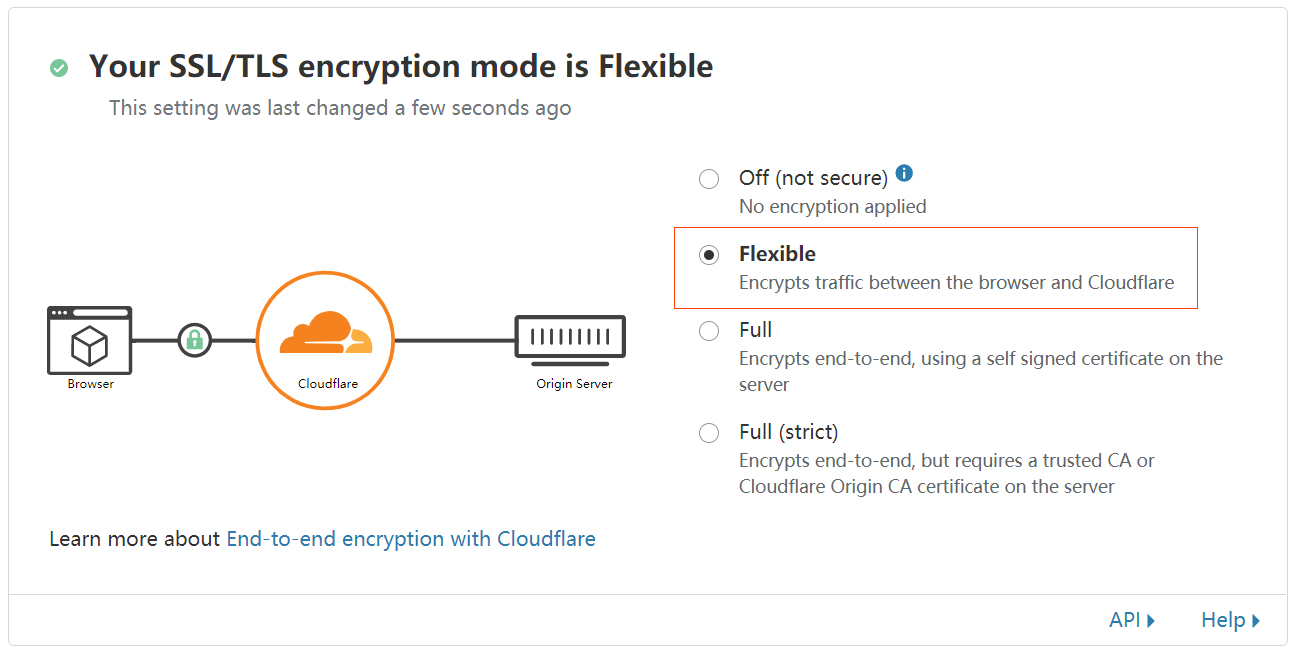 Flexible SSL:您的网站访问者和Cloudflare之间有加密连接,但是从Cloudflare到您的服务器没有加密。即半程加密。优点在于:你的网站不需要SSL证书,用户也能实现SSL加密访问。