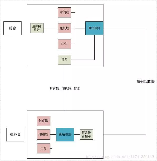 前台生成一个签名,当需要访问接口的时候,把时间戳,随机数,签名通过URL传递到后台。后台拿到时间戳,随机数后,通过一样的算法规则计算出签名,然后和传递过来的签名进行对比,一样的话,返回数据。