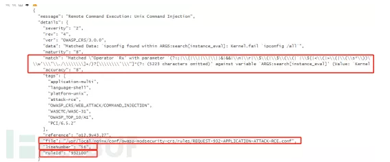 在match字段中是匹配到的正则表达式,在这里可以判断触发是否合理,file字段是正则表达式所在的文件,可以对规则进行修改,ruleId是规则标号,可以直接过滤掉此条规则,之后将不在对此ID的规则进行检测。