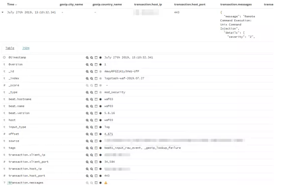 于此同时在ELK中做日志分析,取transaction.messages:*的值,因为modsec日志输出时如果使用的是json格式,告警name就是transaction.messages,取他所有的值用作分析,如果做触发数量统计便可以取值中的message字段。