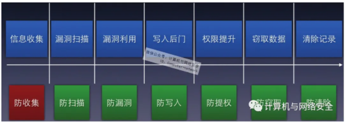 关于防御,它其实是基于攻击来展开的。在攻防对抗的理念中,攻击总是优于防御的。利用攻击来驱动防御,在设计防御策略时,就需要牢记两个重要的安全原则:Design For Failure和纵深防御,这里的Design For Failure是防御思想,它告诉我们没有绝对的安全;纵深防御则是防御行为,它指导我们需要在攻击链条上设置纵深,避免单点防御。综合来说就是,首先需要对攻击链条进行分解,在每个可能的环节点上设置防御,然后对这些防御点进行协同联动,关联阻击,这样才是有效的安全防御。