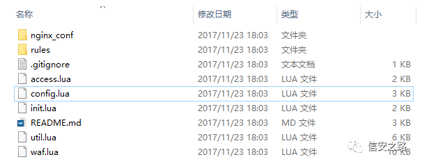 首先看一下整体的目录结构,nginx_conf 目录为参考配置(可删除),rules 目录存放过滤规则,init.lua 加载规则,access.lua 程序启动,config.lua 配置文件