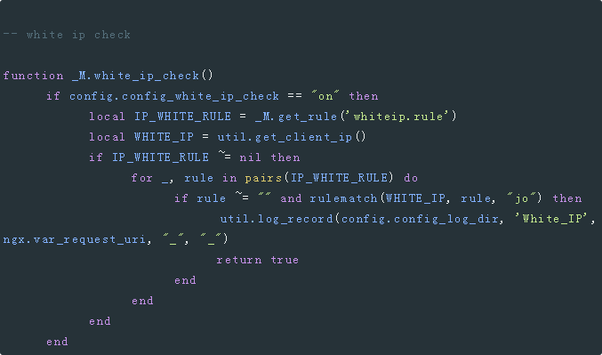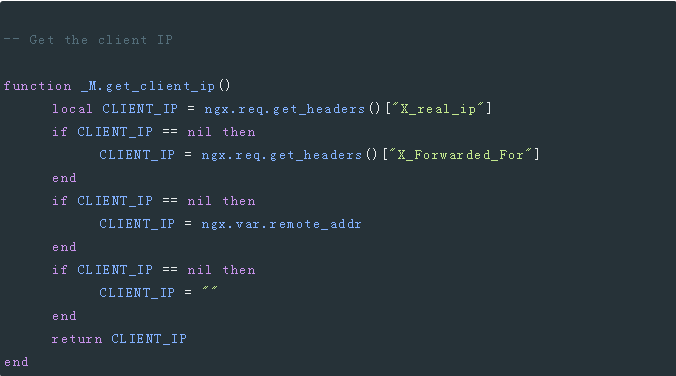 默认配置 IP 白名单是开启状态,读取 IP 白名单规则与获取的客户端 IP 进行比对,我们再来跟进看一下 get_client_ip() 函数,在 util.lua 文件中,第 83-96 行: