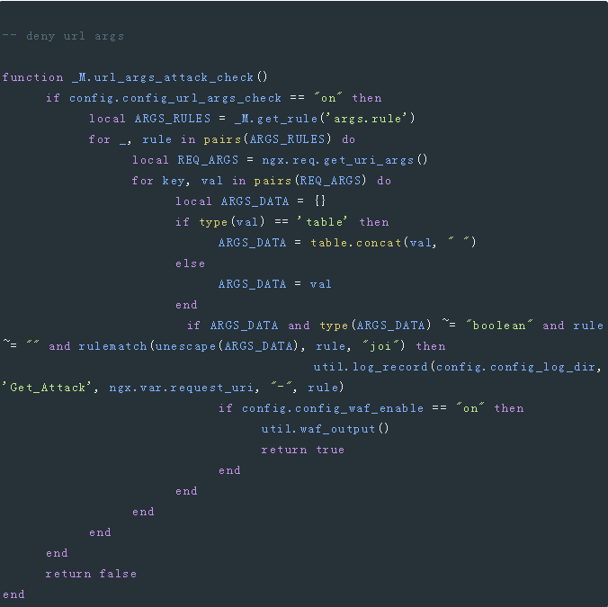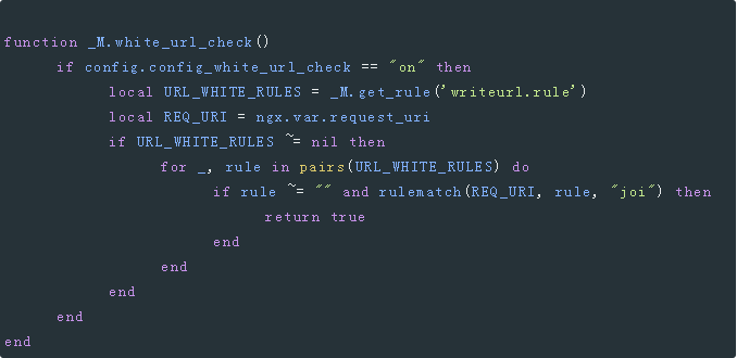两段函数在一定程度上是类似的,使用 ngx.req.get_uri_args、ngx.req.get_post_args 获取数据来源,前者来自 uri 请求参数,而后者来自 post 请求内容,并未对数据进行特殊处理,然后都使用rulematch(data, rule, "joi")来进行匹配。