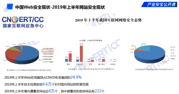 可以看一下2019年上半年的网站安全现状,外部漏洞占整个CNVD漏洞的24.9%。另外我们整个网站的仿冒页面,包括被篡改,除了这些数据,其实还有一些等保合规,包括像一些自动化流量攻击,所有这些攻击的行为都造成整个运营安全防护的需求增长非常迅速,在一些分析机构的报告里面,其实整个应用安全防护的市场,尤其是云上应用安全防护的市场,基本上是以年100%~200%的增速在增长。
