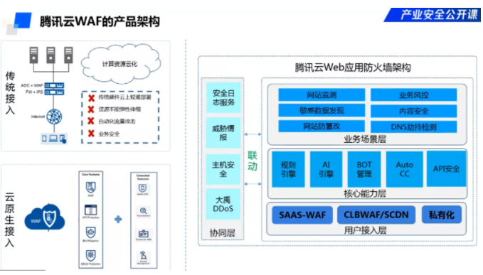 那业务场景其实更多是我们去集成一些上层的安全功能,与此同时我们的产品还有一个协同层,我们会跟我们其他的一些安全产品,包括安全能力,比如说我们的SOC、微信情报,并且我们会跟我们的大禹,就是我们的DDoS产品去做一个联动,去完成一个纵深的防御体系。比如说我们首先在DDOS上,会有大禹先去抵挡这种大流量的攻击,再由WAF应用安全防火墙去抵御一些精细化的这种应用层的攻击。那与此同时我们会跟我们相当于是云安全的眼睛SOC,以及我们的情报去做一些整合,去把我们的日志展现出来,同时利用这些情报提供更多的能力,同时跟我们其他的一些安全产品去做一些整合,去形成一个联动的防御。