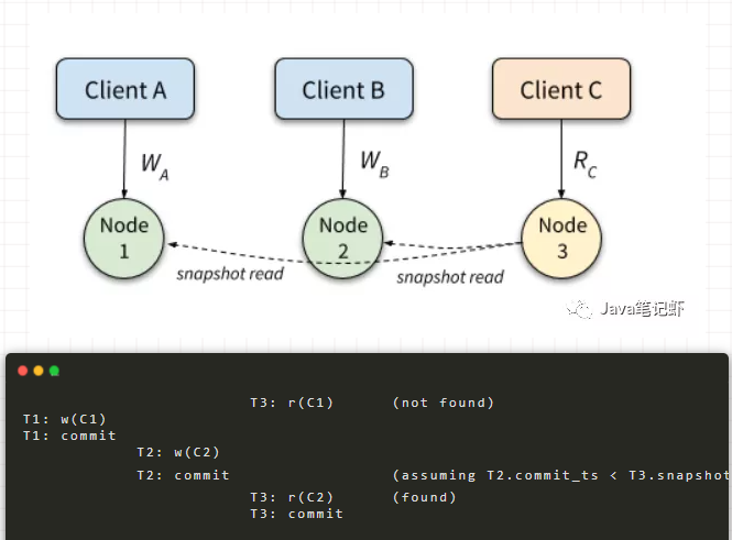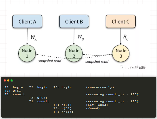 虽然 T1 先于 T2 写入,但 T2 的提交时间戳却小于 T1,于是,并发的读事务 T3 看到了 T2 而没有看到 T1,违反了可线性化。根本原因和 CockroachDB 一样:T1、T2 两个事务的提交时间戳由各自节点计算得出,无法确保先后关系。
