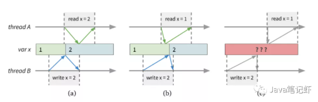 线性一致性的解释。其中 (a)、(b) 满足线性一致性,因为如图所示的时间轴即能解释线程 A、B 的行为;(c) 是不允许的,无论如何 A 都应当看到 B 的写入