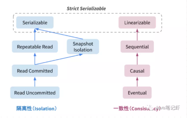注意不要把一致性和隔离级别混为一谈,这完全是不同维度的概念。理想情况下的数据库应该满足 strict serializability,即隔离级别做到 serializable、一致性做到 linearizabile。本文主要关注一致性。