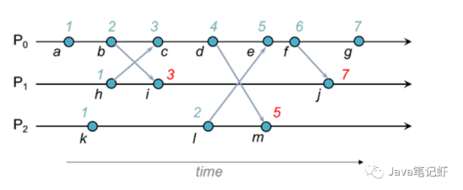 Lamport 时钟是最简单的逻辑时钟(Logical Clock)实现,它用一个整数表示时间,记录事件的先后/因果关系(causality):如果 A 事件导致了 B 事件,那么 A 的时间戳一定小于 B。当分布式系统的节点间传递消息时,消息会附带发送者的时间戳,而接收方总是用消息中的时间戳“推高”本地时间戳:Tlocal=max(Tmsg,Tlocal)+1Tlocal=max(Tmsg,Tlocal)+1。