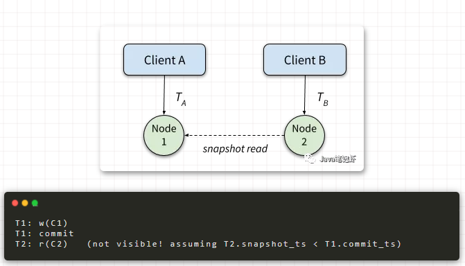 HLC/LC 并不满足线性一致性。我们可以构造出这样的场景,事务 A 和事务 B 发生在不相交的节点上,比如事务 TATA 位于节点 1、事务 TBTB 位于节点 2,那么这种情况下 TATA、TBTB 的时间戳是彼此独立产生的,二者之前没有任何先后关系保证。具体来说,假设 TATA 物理上先于 TBTB 提交,但是节点 2 上发起的 TBTB 的 snapshot_ts 可能滞后(偏小),因此无法读到 TATA 写入的数据。