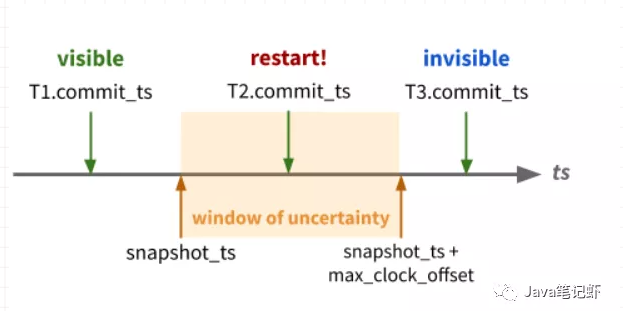下面是最关键的部分:进行 Snapshot Read 的过程中,一旦遇到 commit_ts 位于不确定性窗口[snapshot_ts, snapshot_ts + max_clock_shift]内的数据,则意味着无法确定这条记录到底是否可见,这时将会重启整个事务(并等待 max_clock_shift 过去),取一个新的 snapshot_ts 进行读取。