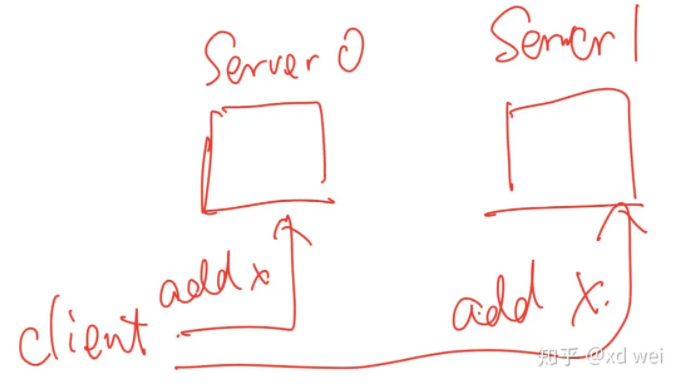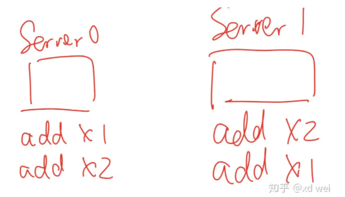由于数据存在备份,那么就会有一致性(consistency)的问题。例如下图所示:一个 client 给发送add x1而另一个 client 发送add x2。由于网络消息的到达可能会乱序,这么两台服务器执行 update function 的顺序会不同,造成不一致。