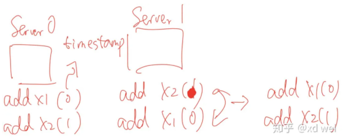 不同步时间戳带来的问题:我们可以看到,在 server0 或者 server1 执行的时候,del x会先于add x执行,这其实违反了用户需要的一致性!通常,在客户端看来,他是先确定添加了x之后才会将其删除。这主要是由于这些请求可能来自于不同的 client;而他们的时间未必会和事件发生的真实事件一致。