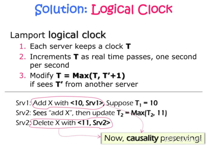 Logical Timestamp 的思想非常简单,如果事件之间有依赖关系,则更新时间戳来体现这种依赖关系。具体的方法,就是将时间戳更新为比依赖事件的时间戳更大。