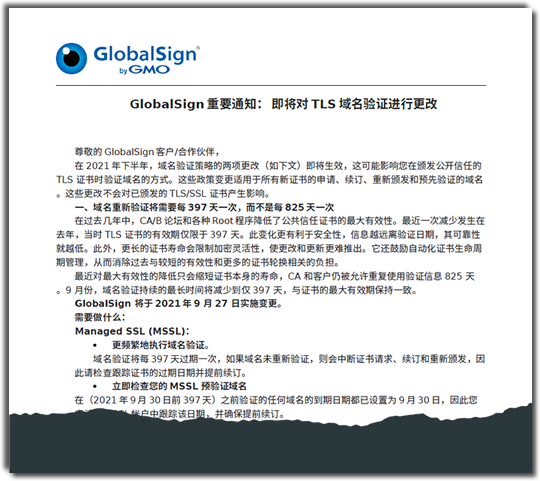 DigiCert 和 GlobalSign相对更加提前,自 2021 年 9 月 27 日起,申请 DigiCert 或者 GlobalSign 的 SSL证书的域名验证有效期缩短为 397 天,届时会有部分域名在续期或者重新签发的时候需重新做域名验证。